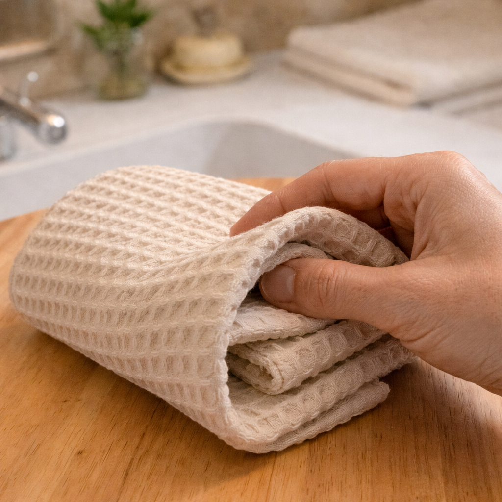 - Face 2 : 100% nid d’abeille 2 × 280 g/m² coton bio certifié