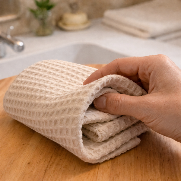 Pour compléter votre coffret, 2 lingettes supplémentaires double face (nid d'abeille/micro-éponge velours de coton bio)