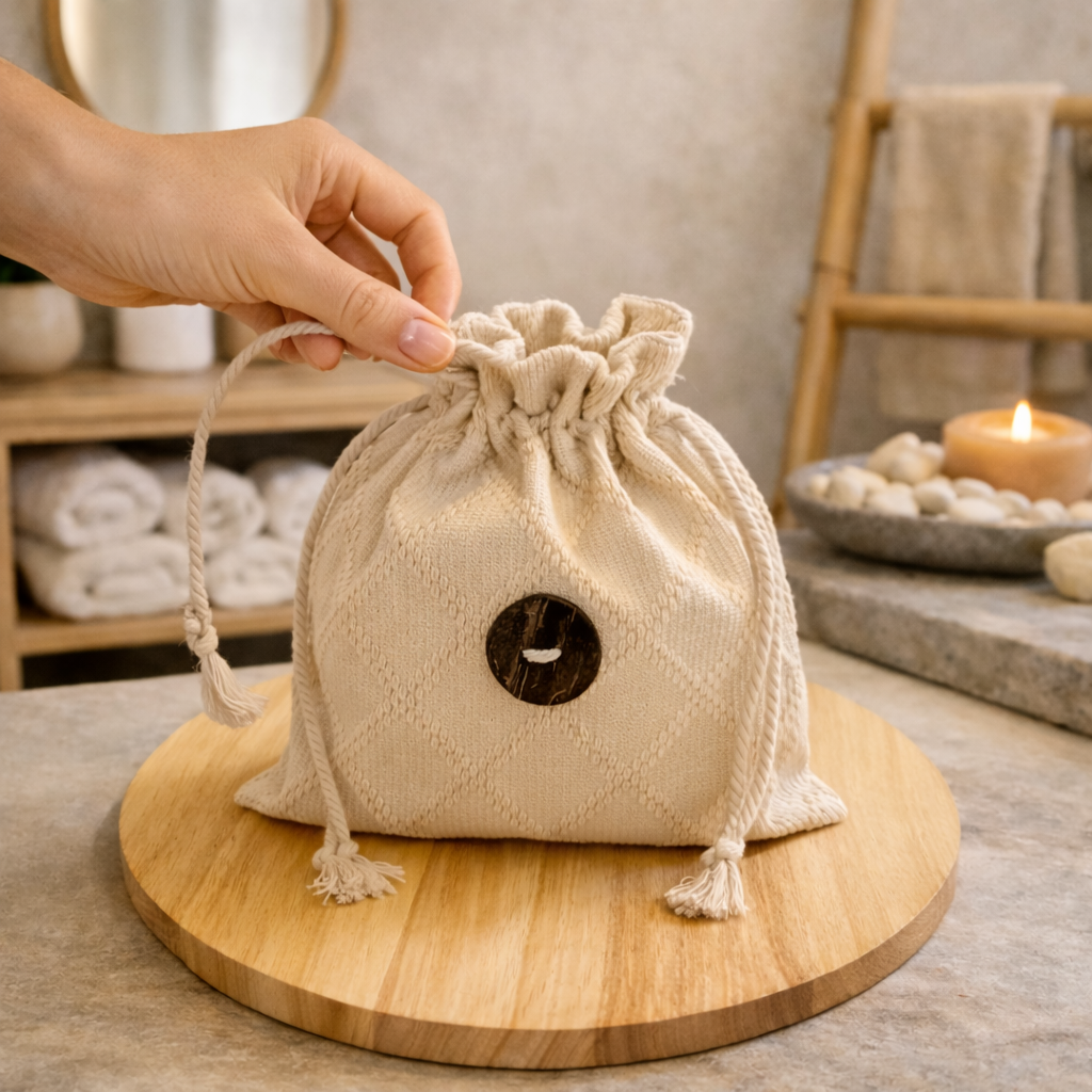 À l’intérieur, vous y trouverez des accessoires durables, faits main, confectionnés avec des matières naturelles, choisis pour sublimer vos instants de soin.