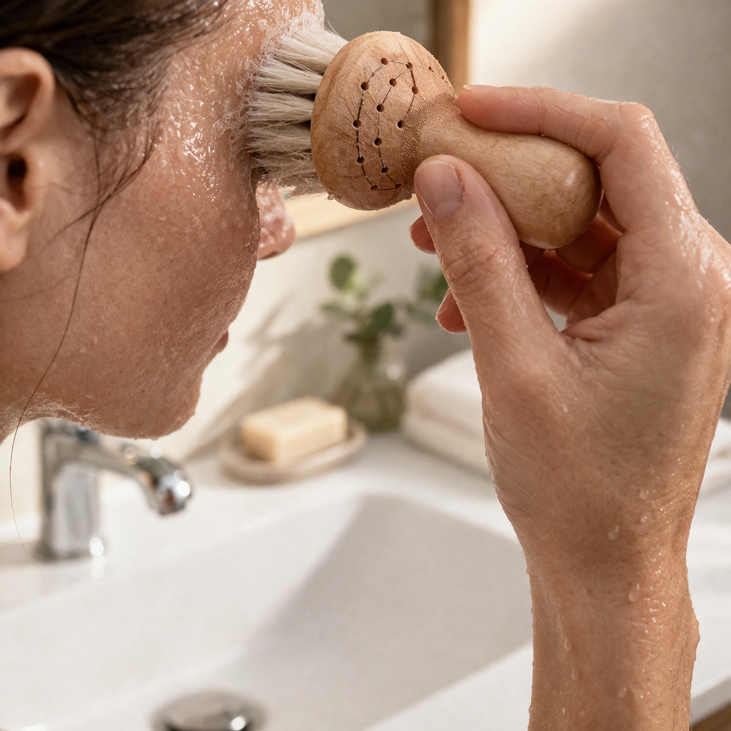 La brosse visage et le savon ont été sélectionnés pour leur qualité artisanale, leur origine européenne et leur parfaite complémentarité avec le rituel.
