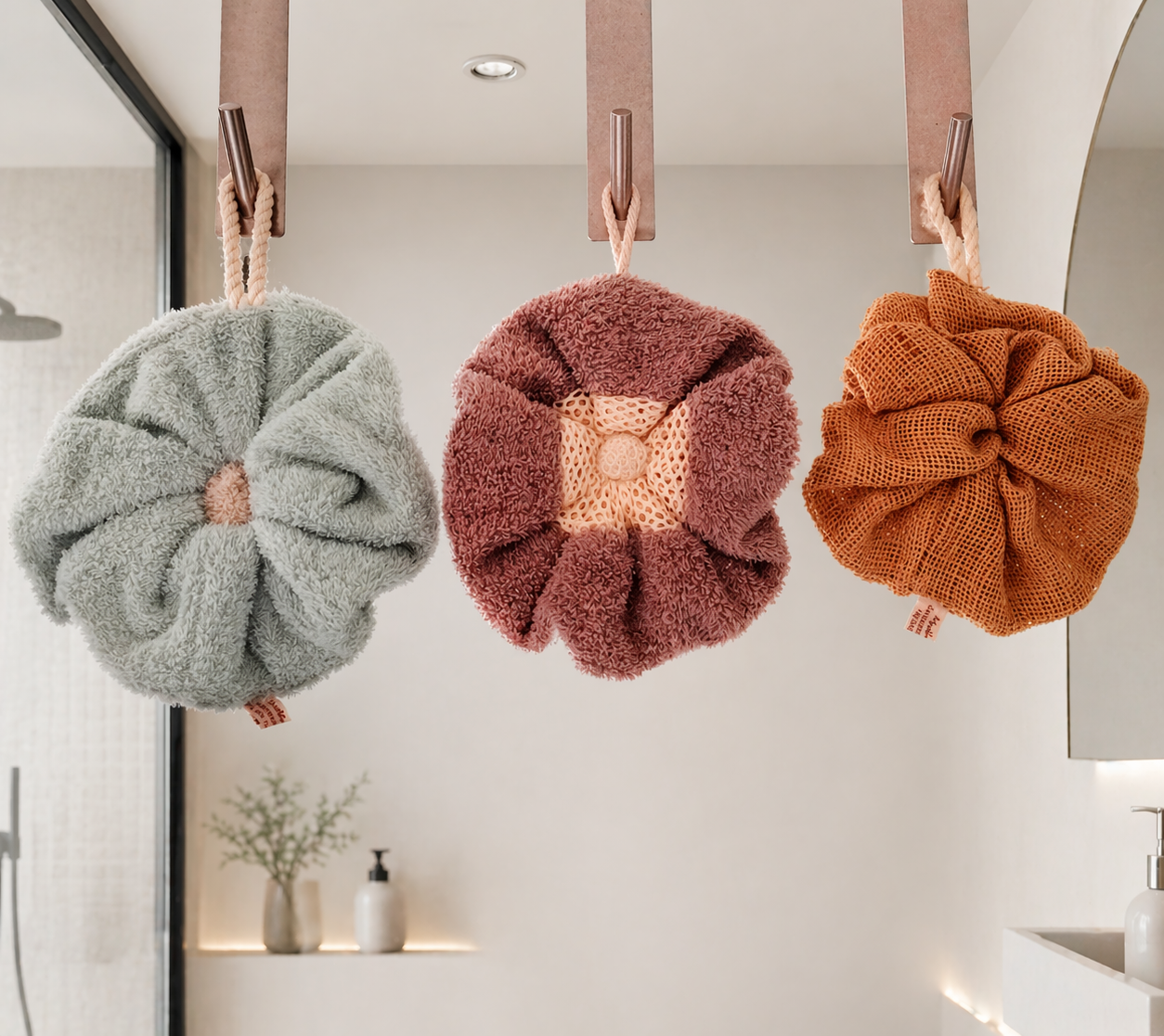 Chaque fleur propose une texture spécifique, permettant d’adapter le geste selon les besoins de la peau — du nettoyage délicat à une exfoliation plus tonique.